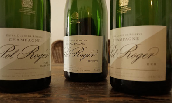 Es gibt drei Champagne aus dem Hause Pol Roger: Den Brut des Hauses, auch White Foil genannt, den Rich, einen halbtrockenen Champagner und schließlich Pure, ohne Dosage. © Originalverkorkt; Christoph Raffelt